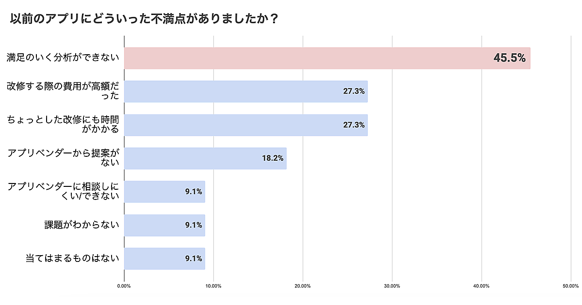 まず「以前のアプリにどういった不満があったのか」を聞くと、「満足のいく分析が出来ない」45.5%が断トツ1位。「改修する際の費用が高額だった」「ちょっとした改修にも時間がかかる」各27.3%がそれに続いた。