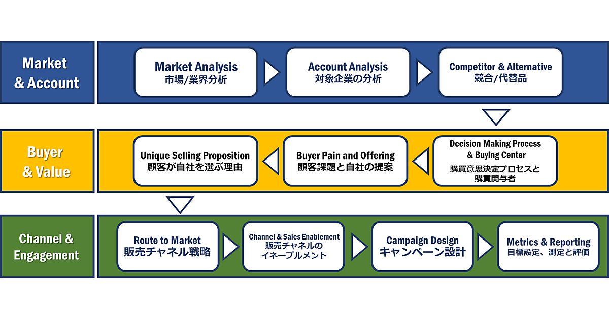 「Market & Account」「Buyer and Value」「Channel and Engagement」の3つのレイヤーで必要情報を収集・整理して共通言語化した。新規市場投入や市場開拓の論理的な勝ち筋や想定費用対効果を明らかにして経営資源の配分など意思決定に役立てる。経営陣・事業部門・マーケティングのそれぞれの部門は、GTM DMIモデルの「戦略の共通言語」を活用して市場開拓・投入計画を策定し、効率的な戦略立案と施策を実行できる。