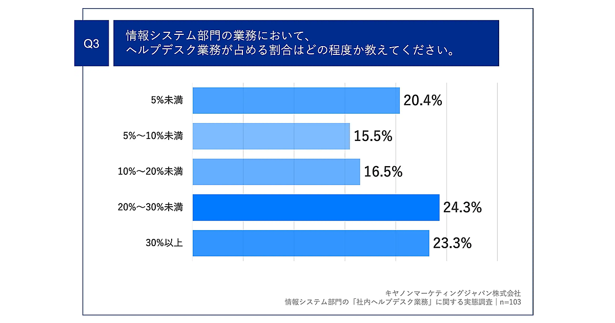 また、情報システム部門の業務において、ヘルプデスク業務が占める割合はどの程度かを聞くと、「20~30%未満」が24.3%、「30%以上」が23.3%という結果になった。