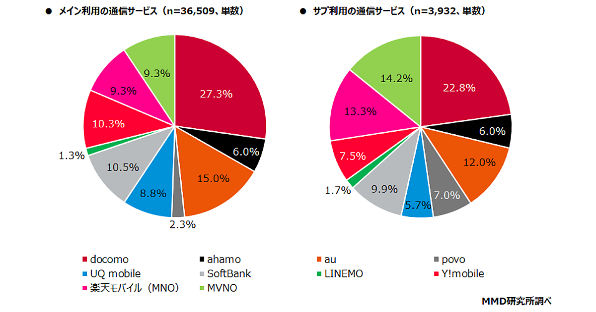 まず18歳~69歳の男女40,000人のうち、通信契約しているスマートフォンを所有していたのは36,509人。「メインで利用しているスマートフォン」の通信サービスを聞くと、「docomo」27.3%、「ahamo」6.0%、「au」15.0%、「povo」2.3%、「UQ mobile」8.8%、「SoftBank」10.5%、「LINEMO」1.3%、「Y!mobile」10.3%、「楽天モバイル(MNO)」9.3%だった。