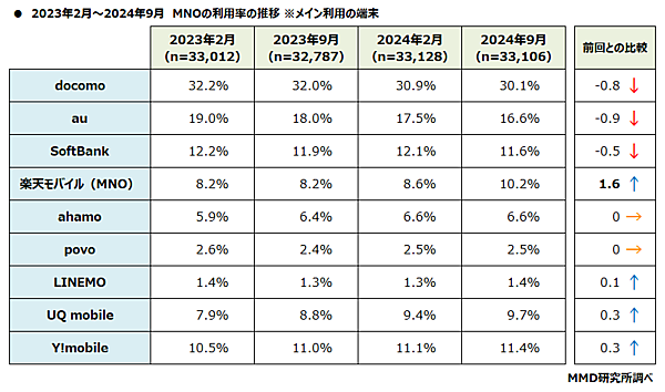MMDLaboが運営するMMD研究所は、「2024年9月 MNOのシェア・満足度調査」の結果を発表した。予備調査では18歳~69歳の男女40,000人、本調査ではMNO利用者2,700人が回答している。