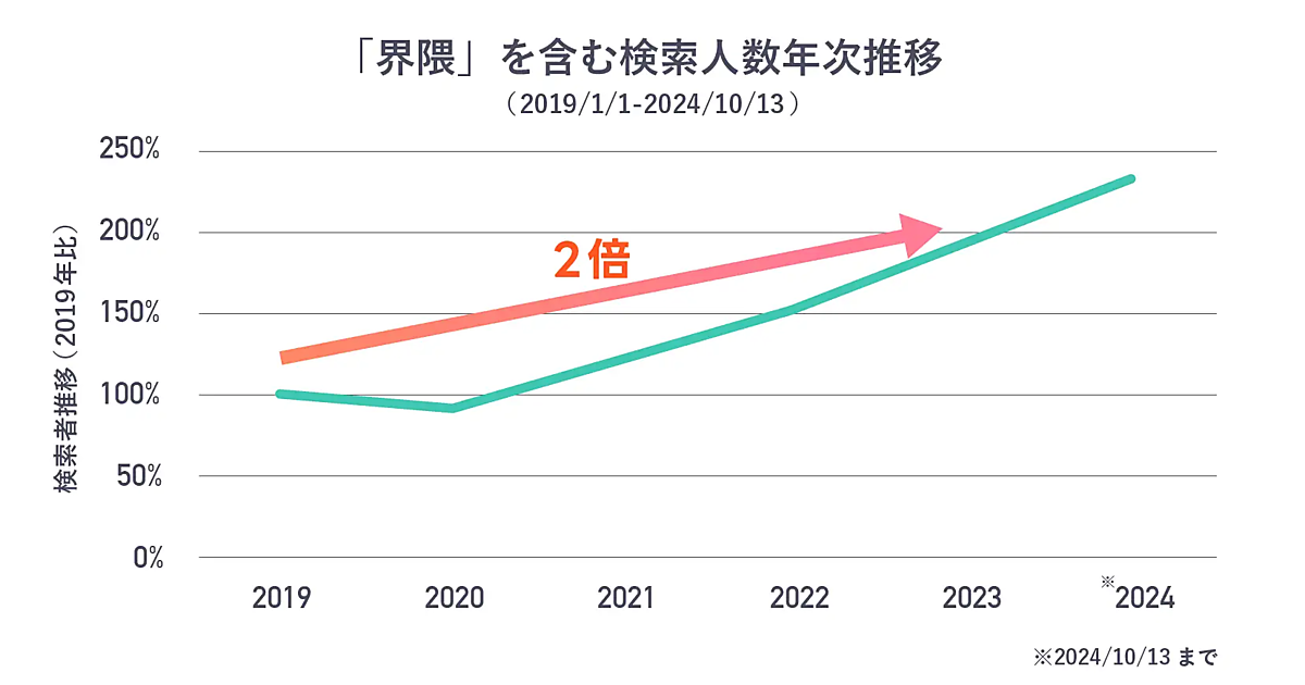 まず、Yahoo!検索のビッグデータから、「界隈」を含むキーワードの検索人数年次推移をみると、2024年10月13日時点では2019年頃と比較して約2倍となり、過去最高となった。