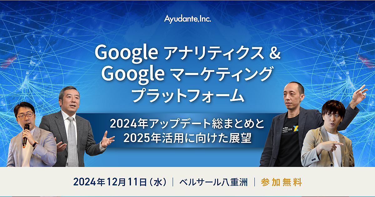 アユダンテは「Google アナリティクス & Googleマーケティングプラットフォーム 2024年アップデート総まとめと2025年活用に向けた展望」を12月11日(水)17:00~19:00にベルサール八重洲で開催する。事前登録制で無料。