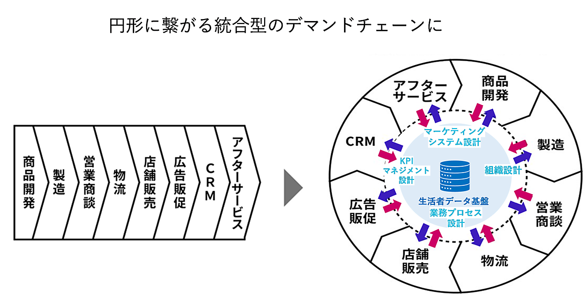 その他に想定されるCxOアジェンダでは、デマンドチェーンを統合した生活者データ基盤の構築や、生成AI(人工知能)を活用したマーケティングプロセス変革などがある。企業のサプライチェーン最適化ニーズは、DX(デジタル変革)の浸透で一巡して成熟期を迎え、今後は生活者接点から生成されるデータを活用した機動的な意思決定を実現するデマンドチェーン変革になる。両社は協業によって企業のデマンドチェーン変革を推進していく。