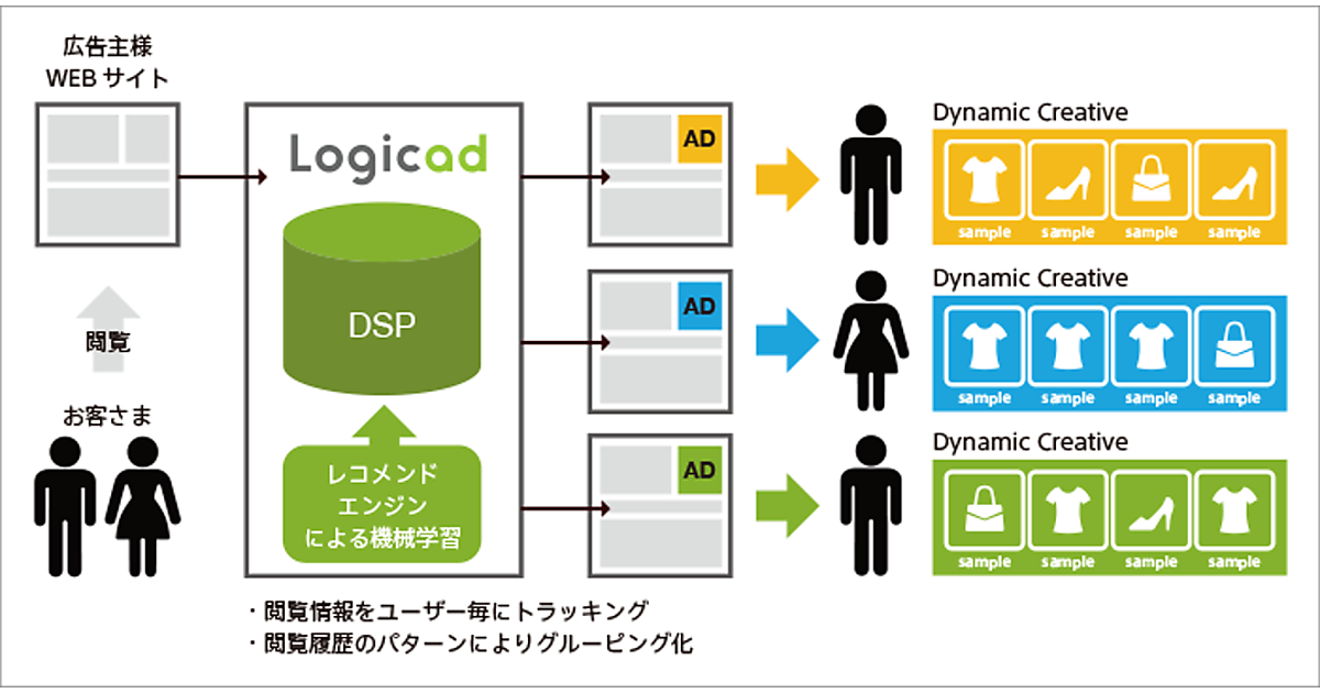 ダイナミッククリエイティブは、広告主のサイトに来訪したユーザーに、商品ページの閲覧履歴データをもとに最適な広告クリエイティブを自動的に生成してクリックやコンバージョン(つながり)を促進する配信メニュー。ソニーグループで培った技術がベースの高度な分析アルゴリズムと高精度なレコメンドエンジンを搭載する。機能をアップデートして、3rd Party Cookieを制限したSafariブラウザ面で動的な広告配信を可能にした。