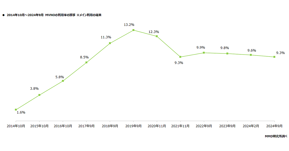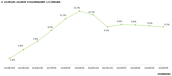 MMDLaboが運営するMMD研究所は、「2024年9月MVNOのシェア・満足度調査」の結果を発表した。予備調査では18歳~69歳の男女40,000人、本調査ではMVNO利用者1,050人が回答している。