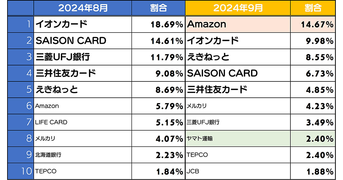 調査によると、2024年9月のフィッシングサイトの割合は「Amazon」が1位で、報告数は約2倍に増加した。「再認証」「カードの有効期限切れ」といった内容でログイン情報を詐取する手口が目立っている。また、メルカリや消費者金融のフィッシングサイトも増加傾向にあり、特に「メルカリ」は9月末から10月にかけて約3倍に増えていた。