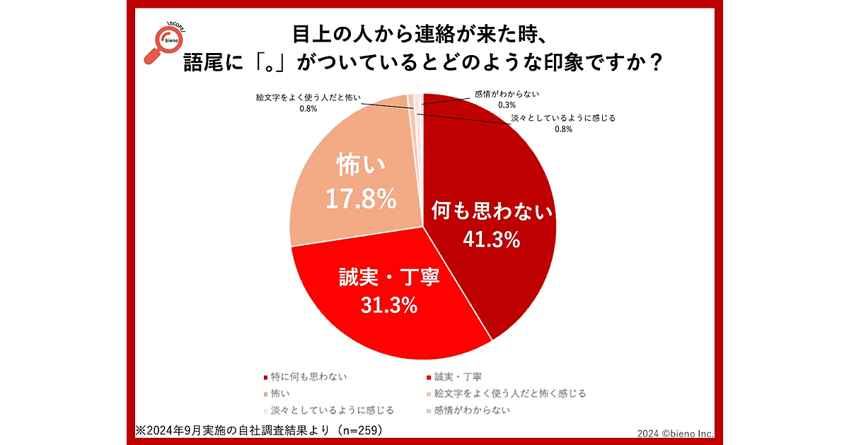 SNSのメッセージなどに句点『。』が付いていると怖い、という意見が若年層で近年増えており、「マルハラ」という言葉も生まれている。そこで「メッセージに句点があることに対してどう思うか」と聞くと、「何も思わない」41.3%が多かったが、残る6割は「誠実・丁寧」「怖い」「感情がわからない」「淡々としているように感じる」など、なんらかの印象を受けていた。「絵文字をよく利用する人が語尾に『。』をつけると怖い」という意見も0.8%ほど存在する。