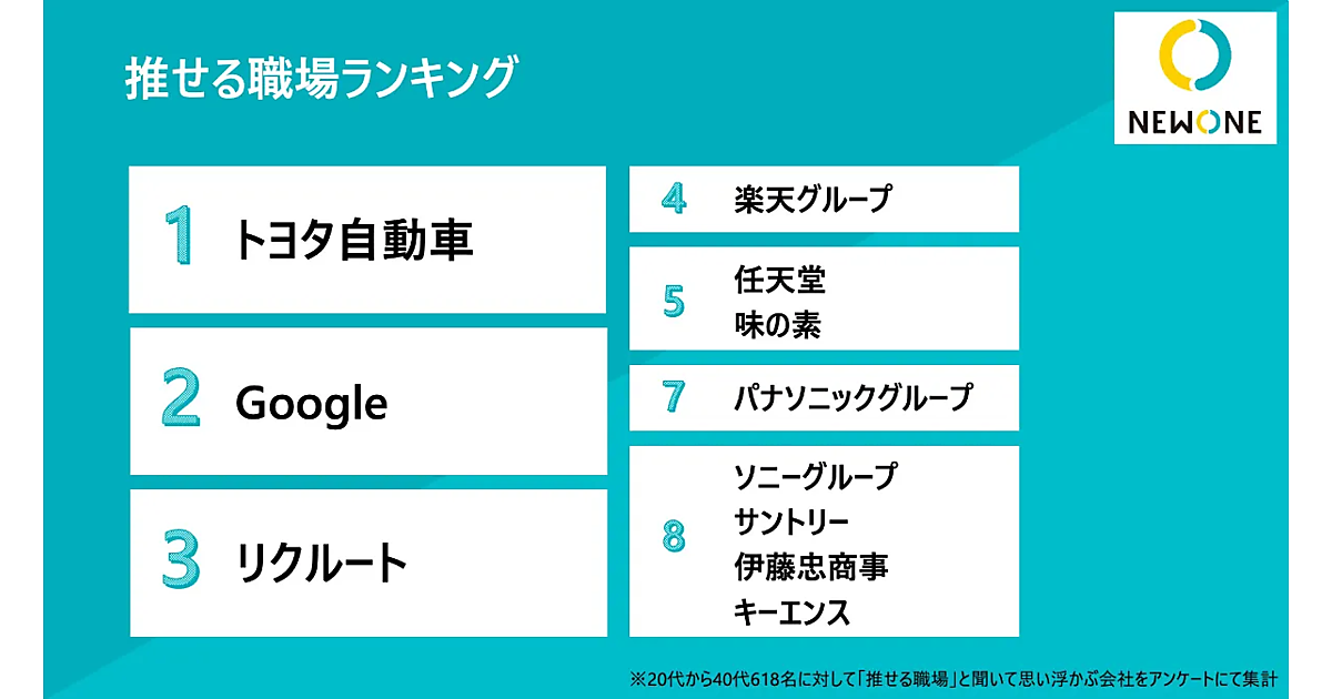 NEWONEは、「推せる職場と聞いて思いつく企業」に関する調査結果を発表した。「働きがいがあり、働きやすい職場」を“推せる職場”と定義し、20代~40代の会社員618名にアンケートを行っている。