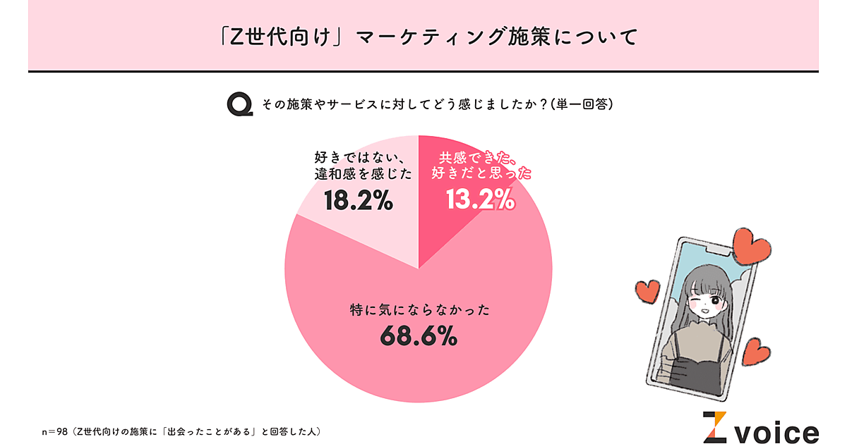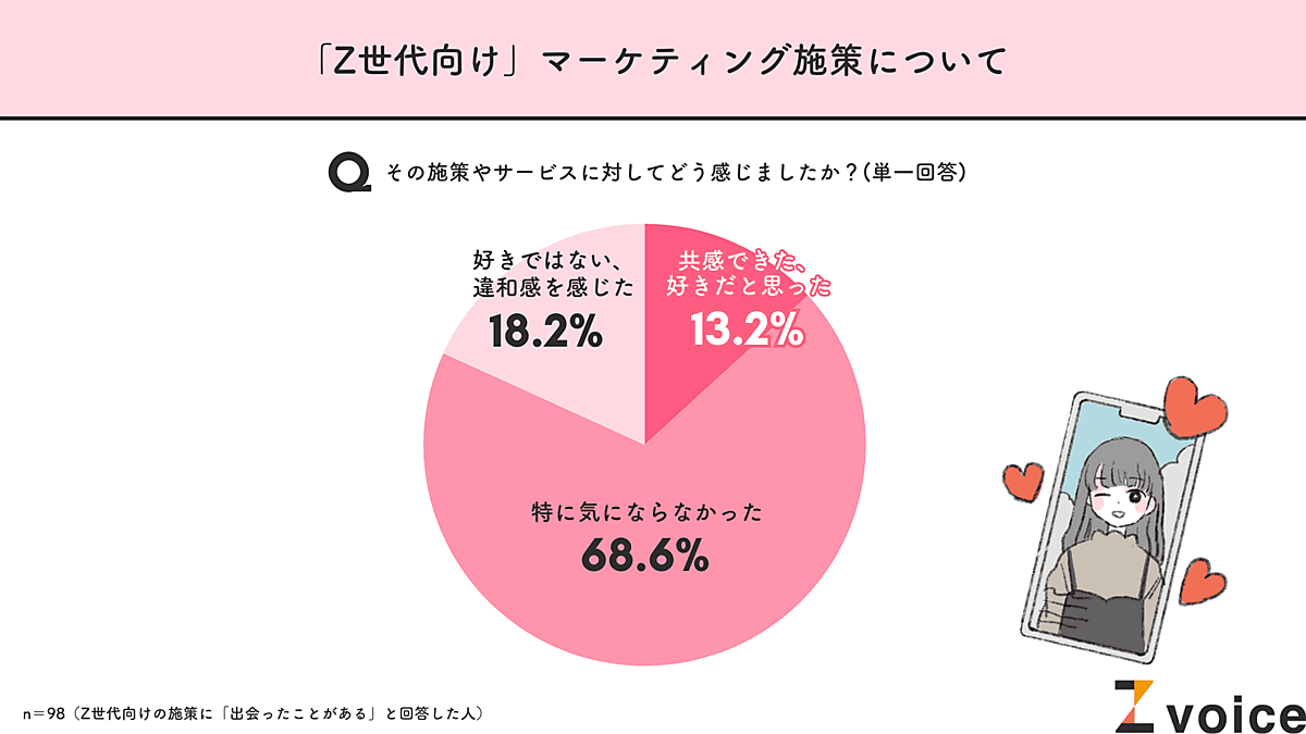 まず「自分たちZ世代に向けられた施策に出会ったことがあるか」を聞くと、「遭遇したことがある」は19.6%(98人)とほぼ2割。その98人は「Z世代向けの施策に対する印象」について、「特に気にならなかった」68.6%が最多だが、「好きではない、違和感を覚える」18.2%がそれに続き、「共感できた、好きだと思った」13.2%を上回った。
