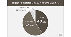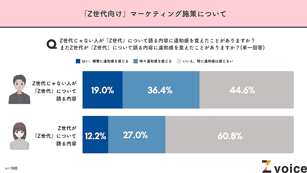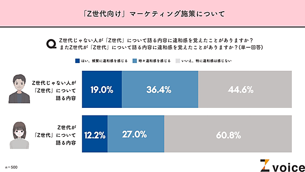 そこで「自分たちとは違う世代が語るZ世代」についてどう思うかを聞くと、「はい、頻繁に違和感を感じる」19.0%、「時々違和感を感じる」36.4%と、合わせた55.4%の過半数が違和感を感じていた。一方「自分たちと同年代が語るZ世代」では39.2%にとどまる。