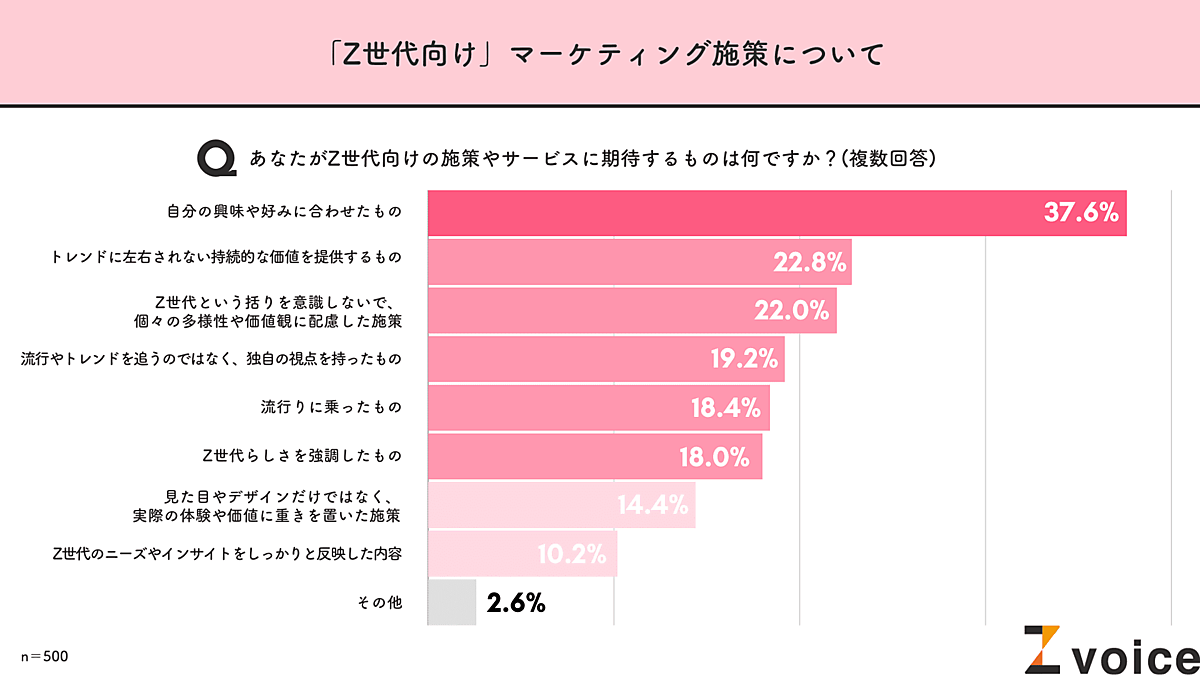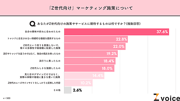 最後に「自分たちZ世代向けの施策・サービスに期待すること」を聞くと、「自分の興味や好みにあわせたもの」37.6%、「トレンドに左右されない持続的な価値を提供するもの」22.8%、「Z世代という括りを意識しないで、個々の多様性や価値観に配慮した施策」22.0%が上位だった。Z世代だけでなくどの世代にも共通して通じるマーケティング施策のほうが好まれていることがわかる。