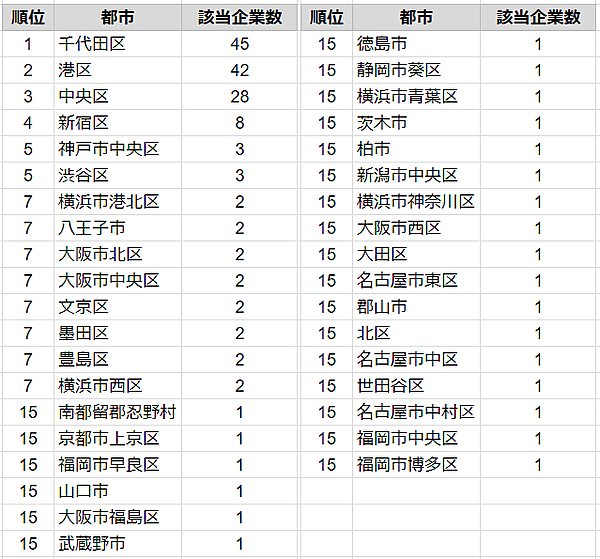 その結果、45社が存在した「東京都千代田区」がランキング1位となった。以下2位「港区」42社、3位「中央区」28社、4位2位「新宿区」8社が続く。そして5位には「神戸市中央区」3社と「渋谷区」3社が同数でランクインした。