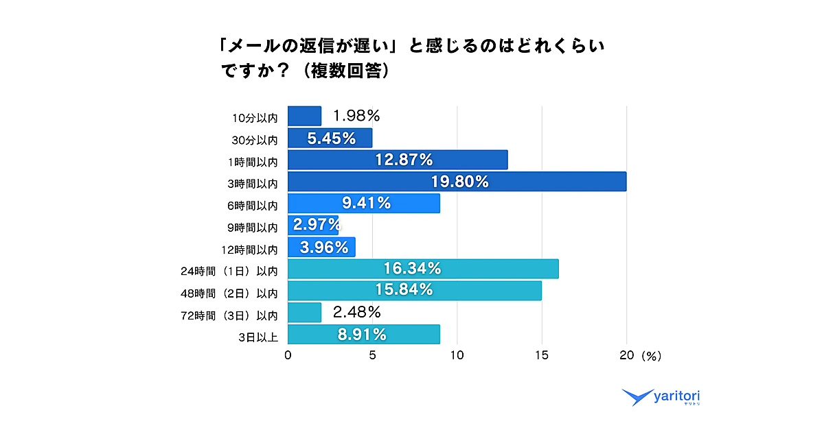 また、どのくらいの時間がかかると「メールの返信が遅い」と感じるかを聞くと、「3時間以内」と答えた人が合計で40.10%にのぼった。そのうち「1時間以内」と答えた人は12.87%を占めており、レスポンスの早さが重視されていることがわかった。