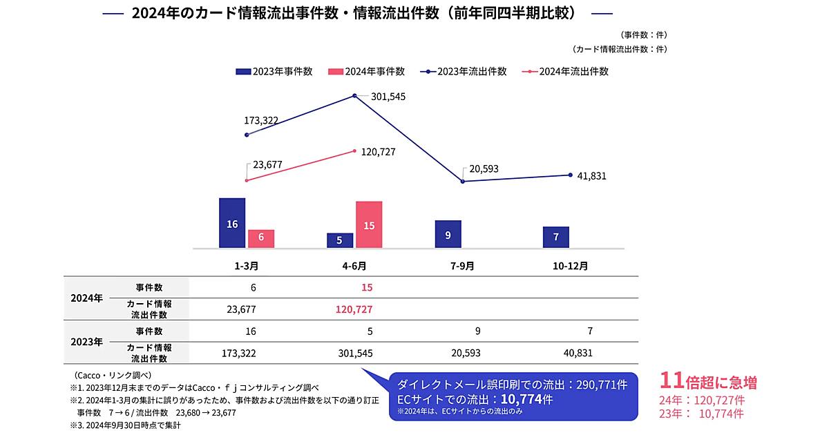 調査によると、2024年4〜6月の流出事件数は15件、カード情報流出件数は120,727件で、1〜3月と比べて約5倍に急増した。また、2023年4〜6月はダイレクトメール誤印刷での流出が290,771件、ECサイトからの流出は10,772件となっており、前年同期比で見ると、ECサイトからのカード情報流出件数は11倍超と大幅に増加した(2024年はECサイトからの流出のみを集計)。