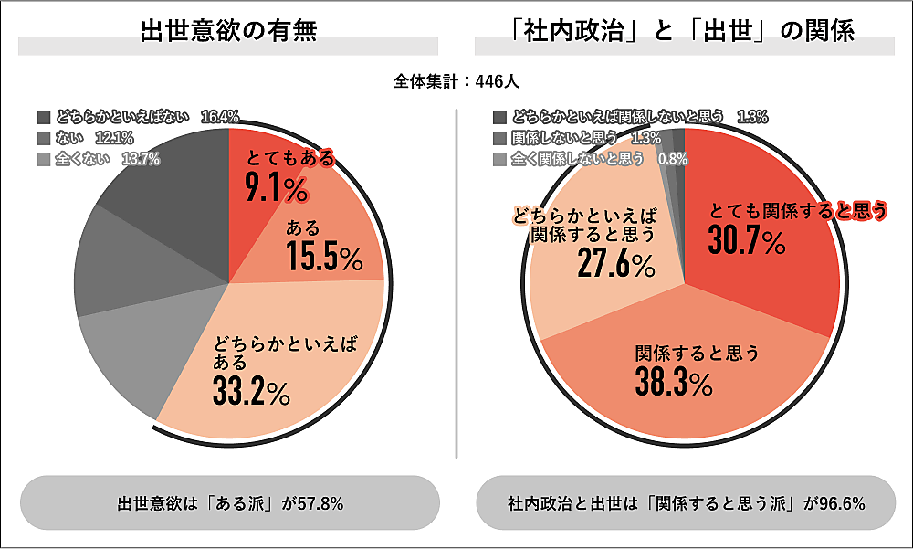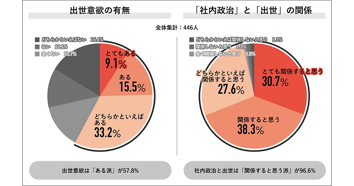 6割近くが意欲ありとした。また「社内政治と出世は関係するか」と聞くと、内訳は「とても関係すると思う」30.7%、「関係すると思う」38.3%、「どちらかといえば関係すると思う」27.6%で、計96.6%と圧倒的多数が関係ありと回答した。出世意欲がある人にとって、社内政治は見過ごせない話題だろう。