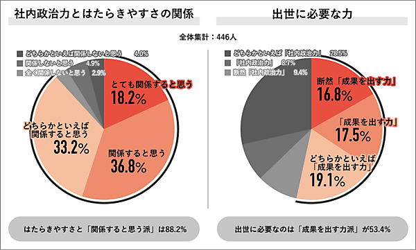 パーソルキャリアが運営する調査機関「Job総研」は、「社内政治の実態」に関する調査結果を発表した。出世意欲の有無と社内政治と出世の関係、社内政治力の定義と職場の実態や働きやすさとの関係、さらに出世に必要な力などについて、20~50代の社会人男女446人が回答している。