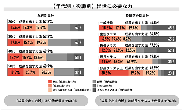 「社内政治ははたらきやすさに関係するか」を聞くと、「とても関係すると思う」18.2%、「関係すると思う」36.8%、「どちらかといえば関係すると思う」33.2%で、関係すると思う人はほぼ9割。一方で「出世には社内政治力と成果を出す力のどちらが必要か」では、「断然成果を出す力」16.8%、「成果を出す力」17.5%、「どちらかといえば成果を出す力」19.1%で、わずかに成果を出す力が上回った。年代別・役職別で見ると、50代・部課長クラスが特に多い。