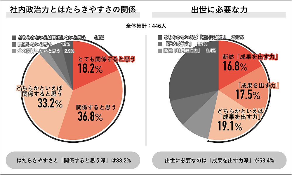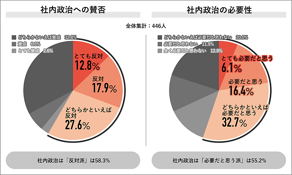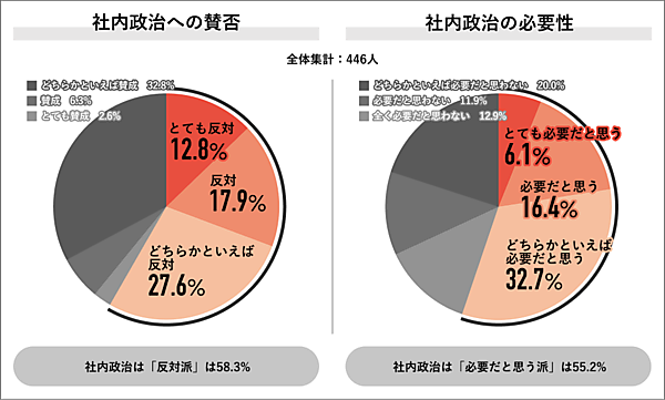 「社内政治への賛否」を聞くと、「反対派」58.3%で半数を超えた一方、「社内政治の必要性」については、「必要だと思う派」55.2%が同じように半数を超えた。