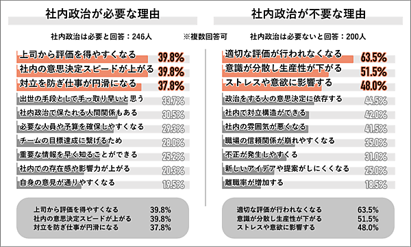 社内政治が必要と回答した246人に理由を聞くと、「上司から評価を得やすくなる」「社内の意思決定スピードが上がる」同率39.8%、「対立を防ぎ仕事が円滑になる」37.8%が上位。不要と回答した200人に理由を聞くと、「適切な評価が行われなくなる」63.5%、「意識が分散し生産性が下がる」51.5%、「ストレスや意欲に影響する」48.0%が上位だった。