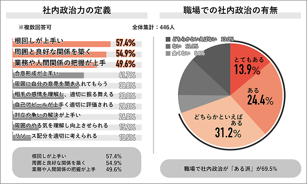 次に「社内政治(社内政治力)の定義」を聞くと、「根回しが上手い」57.4%が最多で、以下「周囲と良好な関係を築く」54.9%、「業務や人間関係の把握が上手」49.6%が続いた。「職場で社内政治はあるか」に対しては、「とてもある」13.9%、「ある」24.4%、「どちらかといえばある」31.2%で、ある派が69.5%を占める。