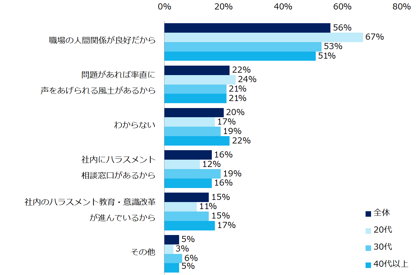 また、職場でハラスメントを受けたことが「ない」と回答した人に「ハラスメントを受けない理由は何だと思いますか?」と聞くと、最多は「職場の人間関係が良好だから」56%だった。年代別では、20代(67%)が30代(53%)、40代(51%)より10ポイント以上高い。なお男女では差異は見られなかった。