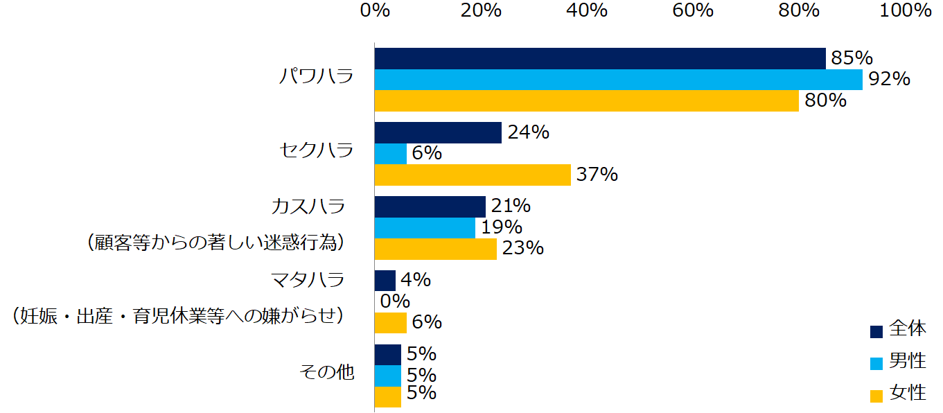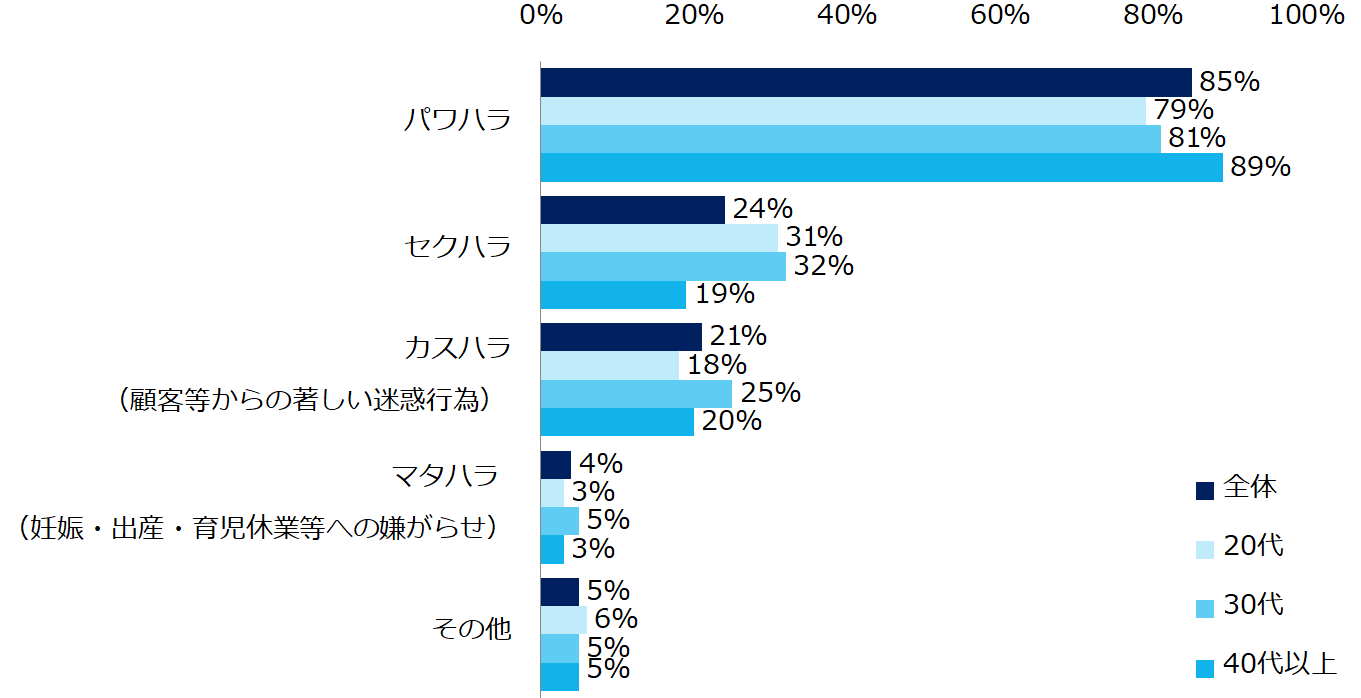 一方、職場でハラスメントを受けたことが「ある」と回答した人に「どんなハラスメントを受けましたか?」と聞くと、「パワハラ」85%が最多。年代別で見ると「セクハラ」について20代が31%であったのに対し、40代以上は19%と大きく下がる。男女別では、男性は「パワハラ」が女性に比べ12ポイント高く(男性:92%、女性:80%)、女性は「セクハラ」が男性に比べ31ポイント高かった(男性:6%、女性:37%)。