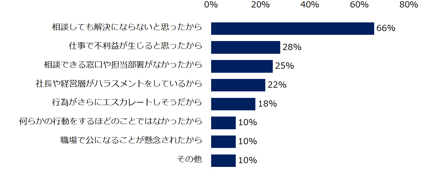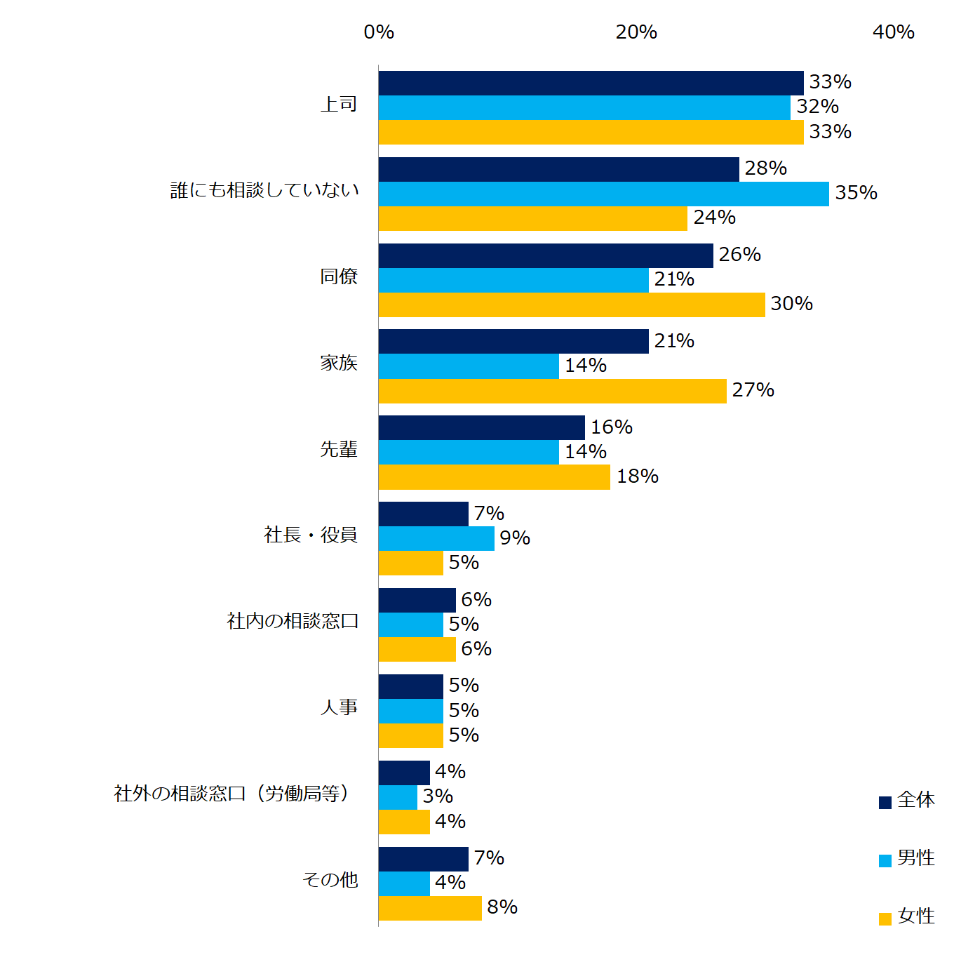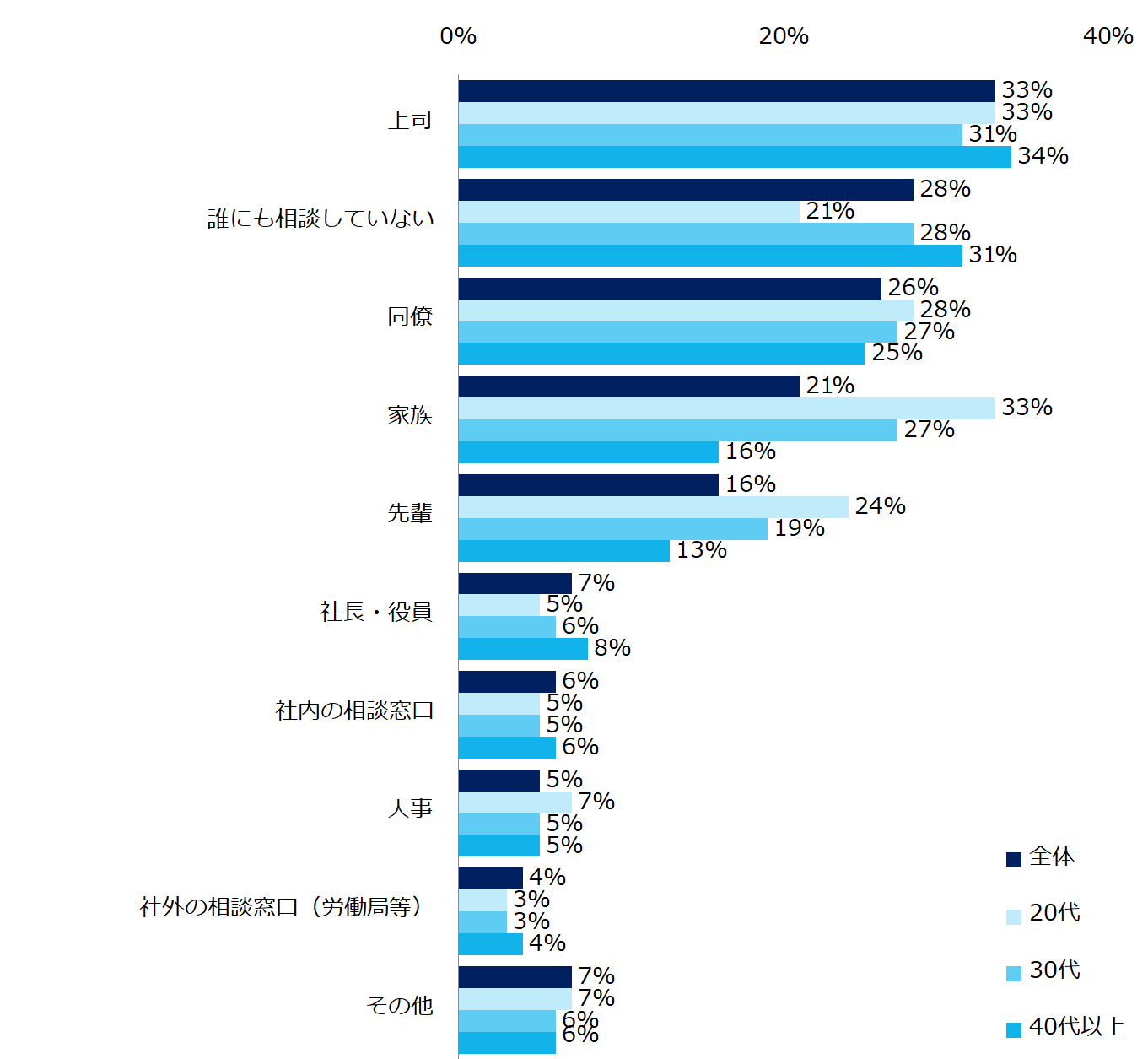 職場でハラスメントを受けたことがある人に「誰かに相談しましたか?」と聞くと、「上司」33%、「誰にも相談していない」28%、「同僚」26%が上位。「誰にも相談していない理由」では、「相談しても解決にならないと思ったから」66%が最多だった。年代別では「家族」で17ポイントの差(20代:33%、40代以上:16%)、男女別でも、「家族」で13ポイントの差があった(男性:14%、女性:27%)。