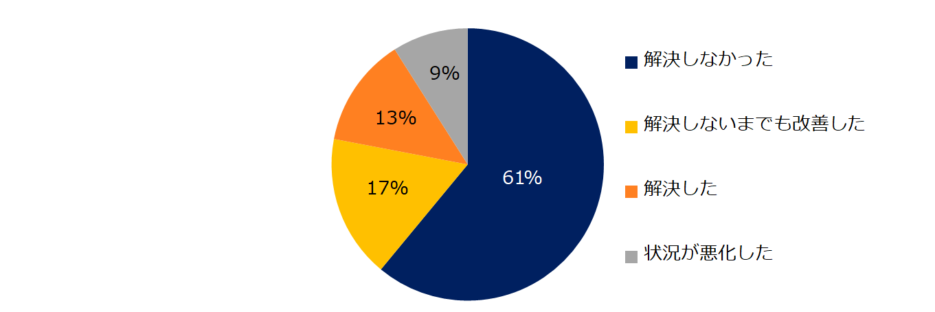 続いて、相談先に「上司、先輩、同僚、人事、社長・役員、社内の相談窓口、社外の相談窓口(労働局等)、家族」のいずれかをあげた人に「相談した結果」について聞くと「解決した」は13%。