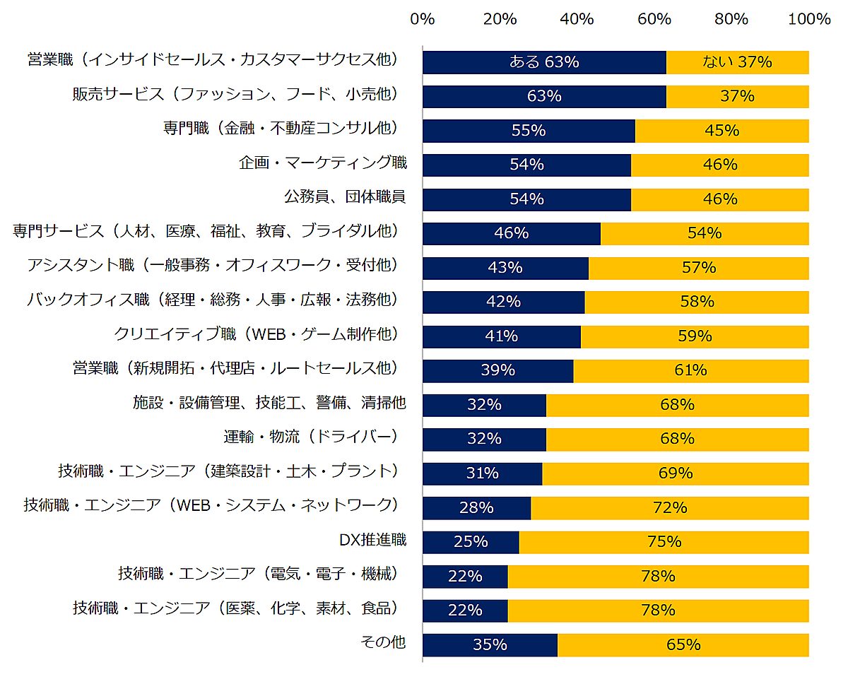 なお、近年増加している「カスハラ(顧客等からの著しい迷惑行為)」について、職場で被害を見たことや、聞いたことがあるかと聞くと、45%が「ある」と回答。「ある」の回答が多かった職種トップは「営業職(インサイドセールス・カスタマーサクセス他)」「販売サービス(ファッション、フード、小売他)」各63%。業種別では「流通・小売(百貨店・コンビニ・専門店など)」65%が最多だった。
