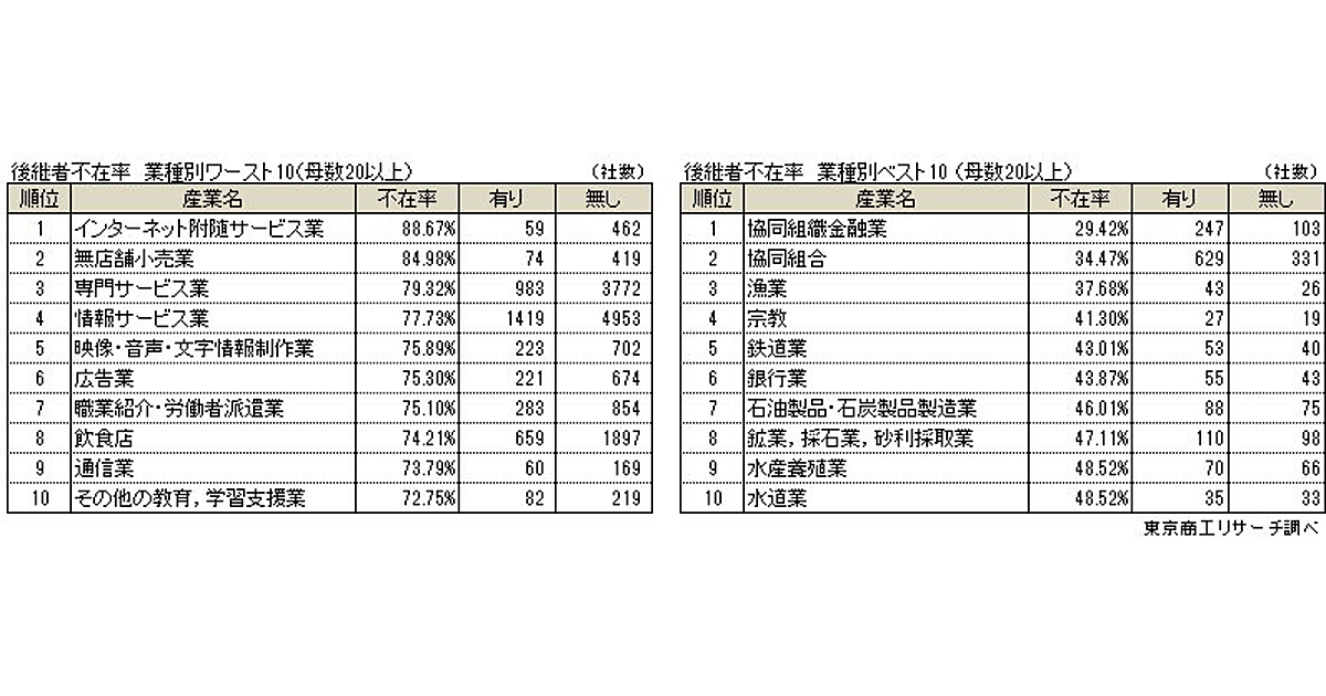 また業種別でみると、後継者不在率が最も高いのは「インターネット附随サービス業」の88.67%となった。ワースト10の上位業種を見ると、インターネット通販を含む無店舗小売業や情報サービス業、通信業などが並んでいる。一方で、不在率が低い業種としては、「協同組織金融業」が29.42%、「協同組合」が34.47%、「漁業」が37.68%の順となった。