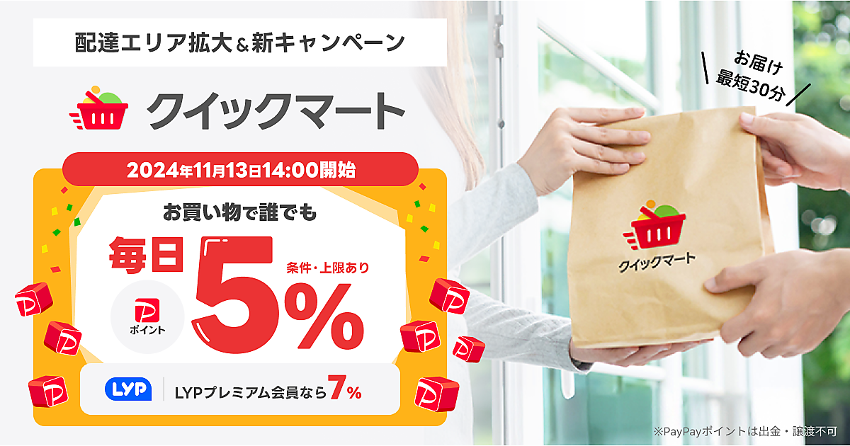 Yahoo!クイックマートは、LINEヤフーのオンラインショッピング「Yahoo!ショッピング」から利用する。配達希望場所の対象エリア内にあるコンビニ、スーパーなどで販売されている商品を選んで注文・決済すると、出前館の配達員が商品を店舗でピックアップして届ける。買い物で付与する「PayPayポイント」を従来の1%から5%に引き上げた。