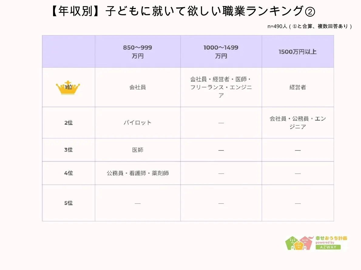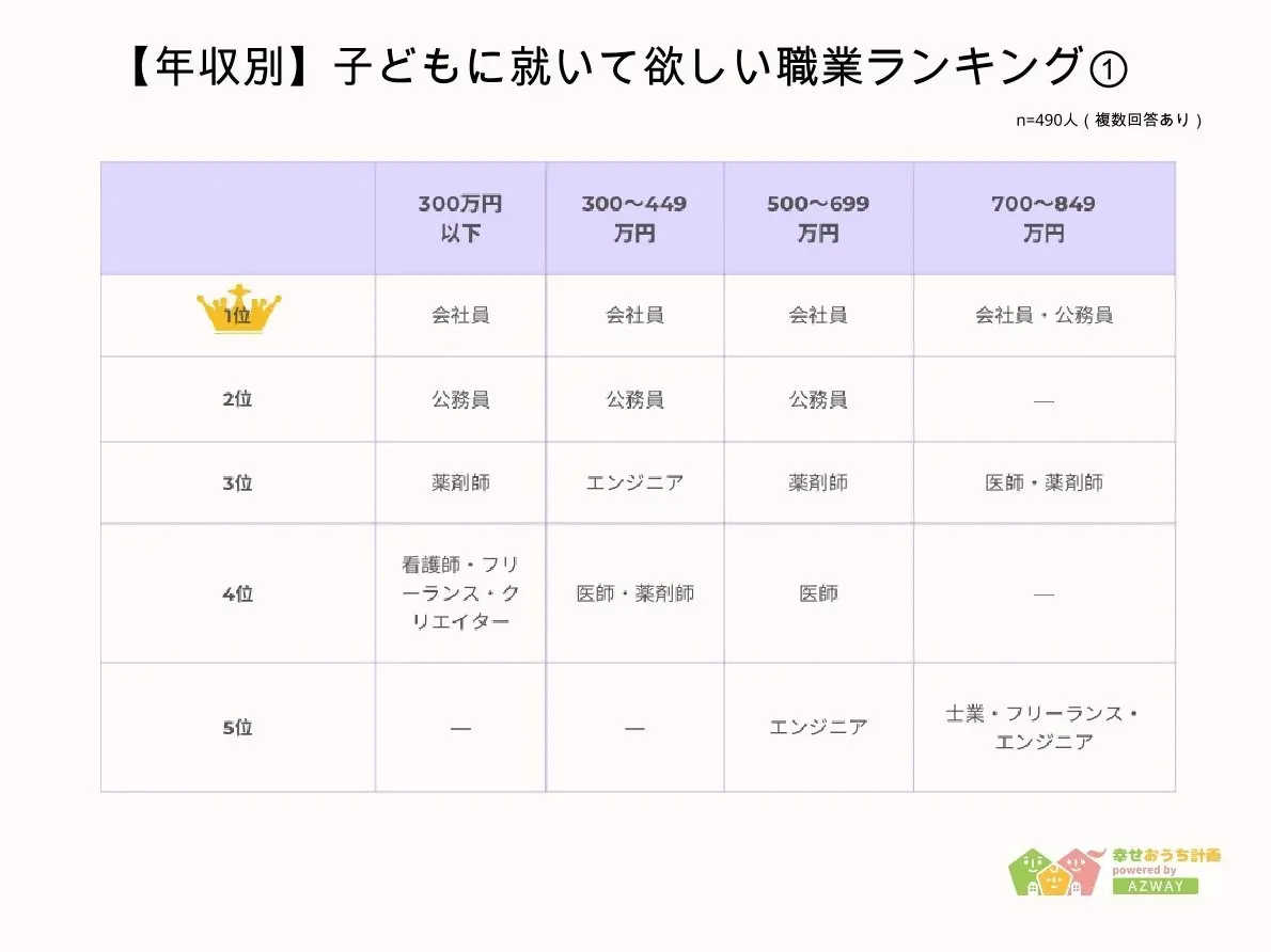 不動産メディア「幸せおうち計画」を運営するAZWAYは、「子どもに就いて欲しい職業」についてのアンケートを実施した。10代から60代以上までの490人が回答している。