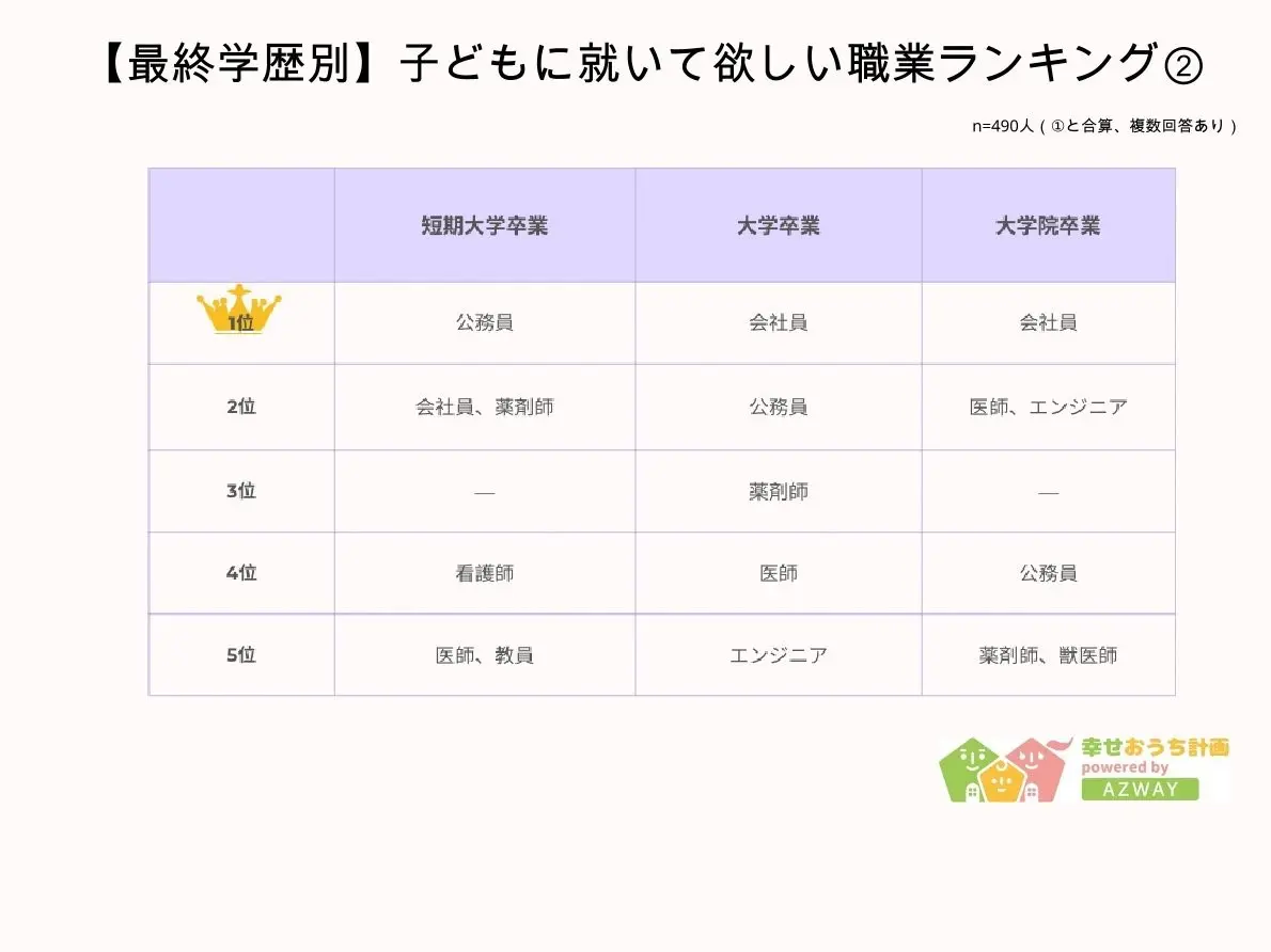 また、最終学歴別でみると、特に「中学校卒業」の人の場合は教員や獣医師など、子どもに求める職種に多様性があることがうかがえた。「大学院卒業」の場合は「医師」「エンジニア」が2位にランクインしており、「公務員」は4位と比較的順位が低い傾向が見られた。