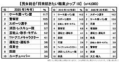 親の年収別でみると、どの年収層でもやはり「会社員」「公務員」を希望する人が多く、「薬剤師」「医師」「エンジニア」などの専門的な職業も人気を集めた。一方で、年収1,000万円を超えると「経営者」が1位にランクインしており、ラインナップに変化が見られた。