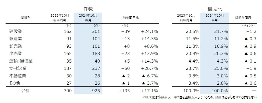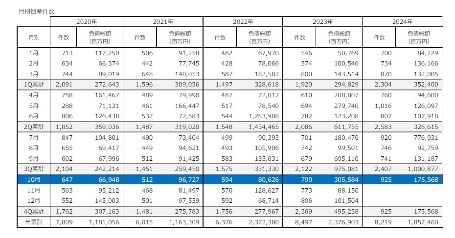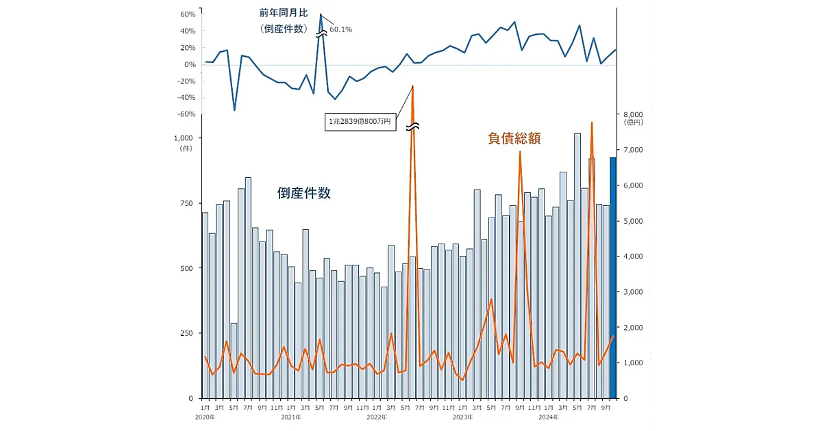 調査によると、2024年10月の企業倒産は925件発生し、前年同月比17.1%増で、30カ月連続で前年同月を上回った。2024年では5月(1,016件)についで2番目に多く、10月としては2013年(918件)以来の900件超えとなった。