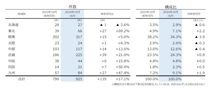 地域別にみると、9地域中8地域で前年同月を上回っており、最も件数が多かったのは「関東」で前年同月比5.0%増となった。特に「千葉」が25件→38件に急増しており、全体の件数を引き上げている。最も増加率が高かったのは「東北」(69.2%増)で、「近畿」は25カ月連続で前年同月を上回った。