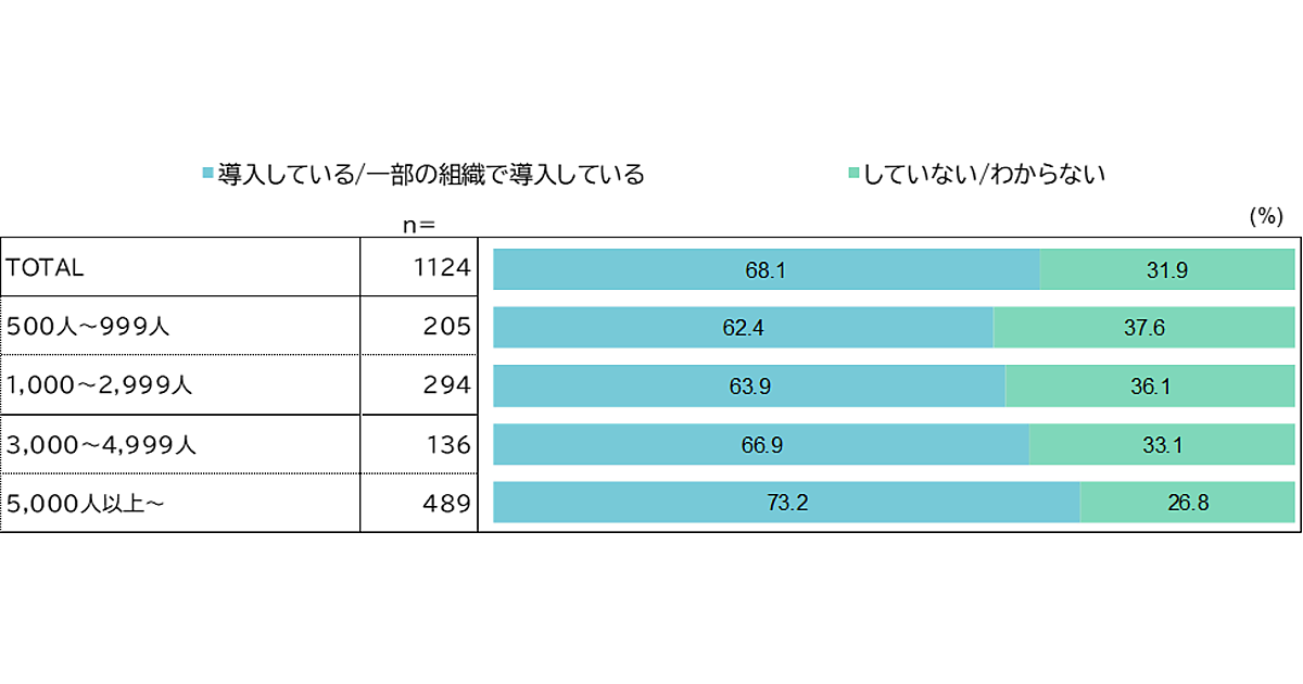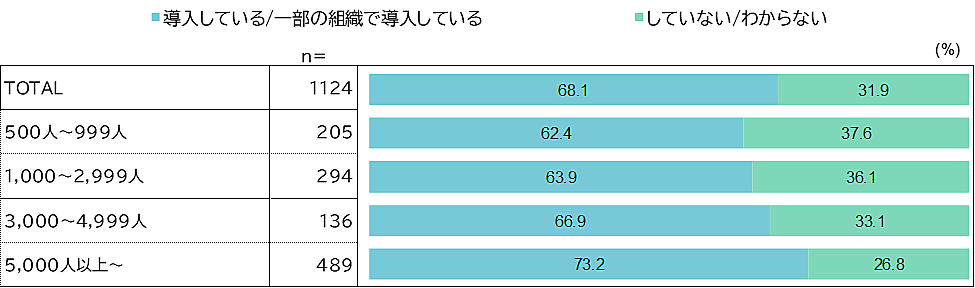 まず「お勤め先の会社では、1on1(上司と部下の頻繁な対話の場)を導入していますか?」と聞くと、「導入している」は68.1%(765人)。企業規模が大きいほど導入率は高い。