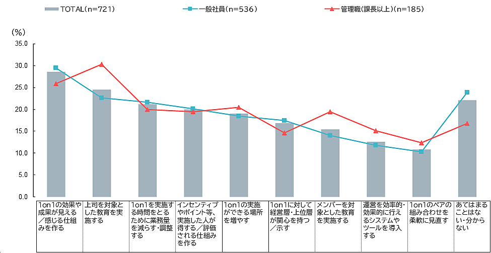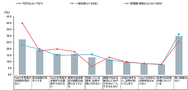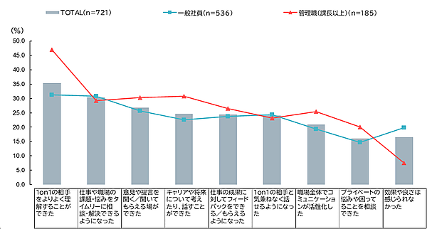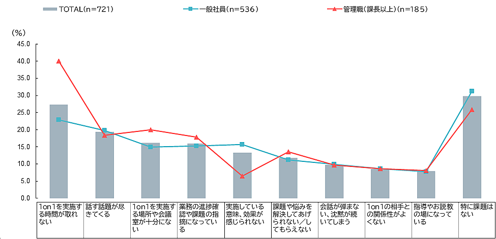 ただし「効果や良さは感じられなかった」が一般社員が全般的に高い。部下側は「1on1のやり方に問題がある」「自分の話したいことが話せてない」「意義や目的が腹落ちしてない状態で1on1を実施している」といった理由が考えられるという。