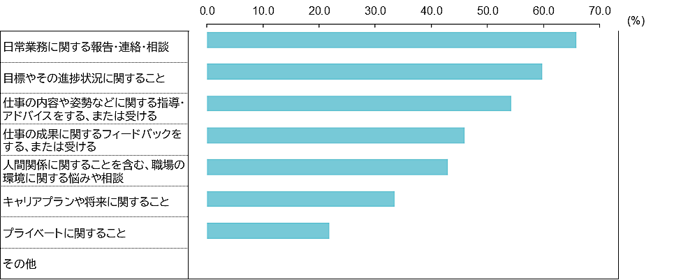 「1on1で話している内容」については、「日常業務に関する報告・連絡・相談」や「目標やその進捗状況に関すること」などが上位。業務の状況が主で、悩みやキャリアプランなどは深掘りできていない様子がうかがえる。