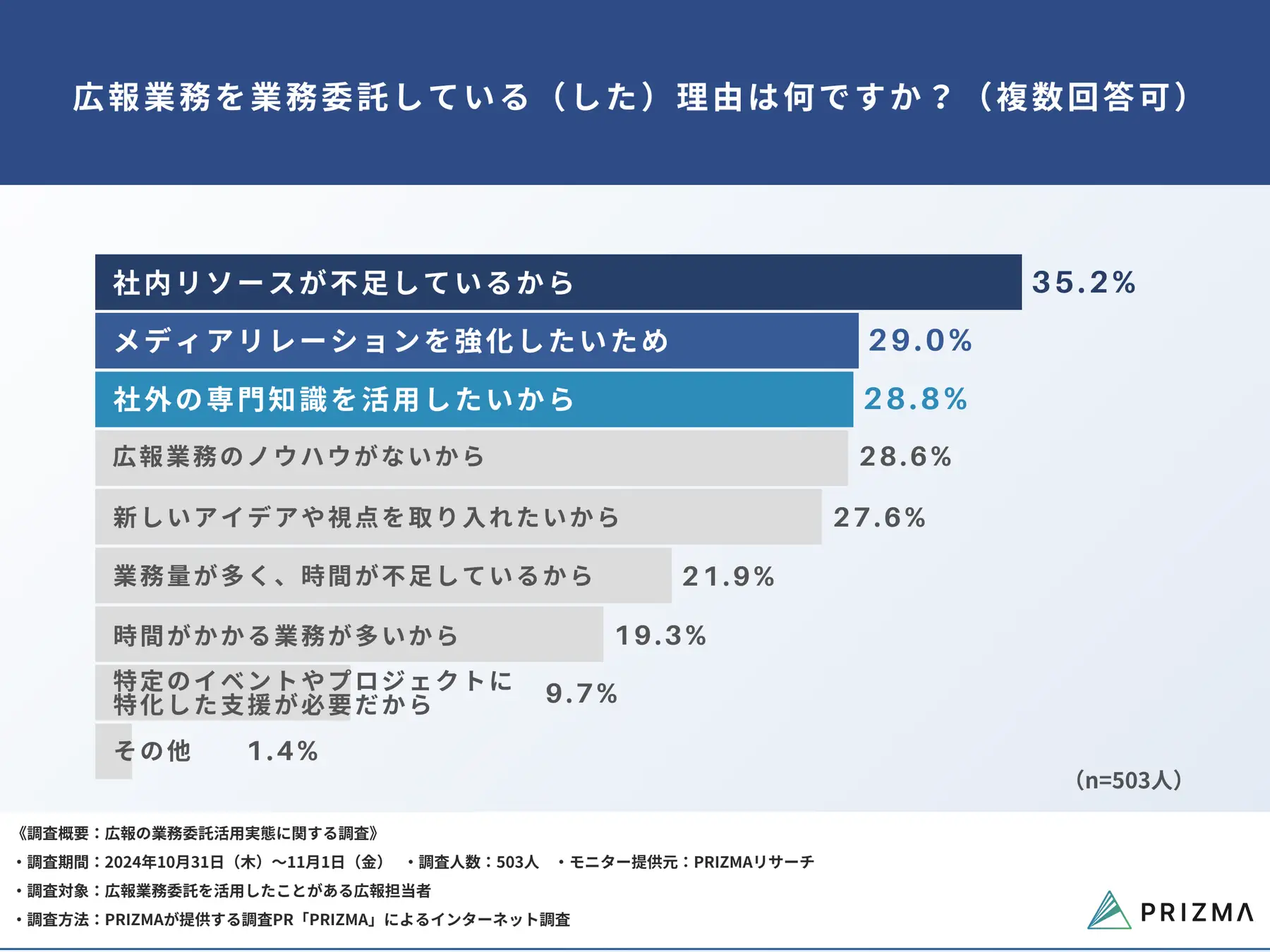 広報を業務委託した理由としては、「社内リソースが不足しているから」が35.2%で最多となり、以下「メディアリレーションを強化したいため」が29.0%、「社外の専門知識を活用したいから」が28.8%と続いた。