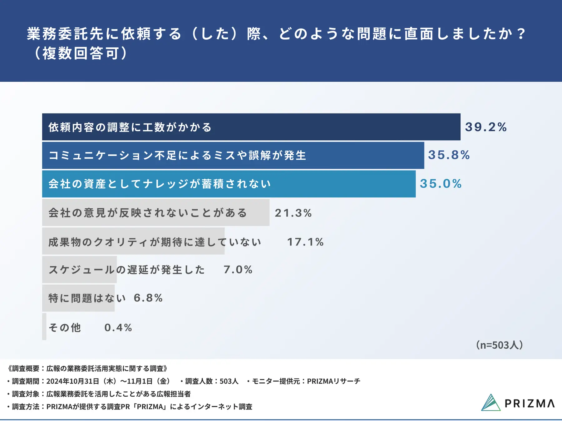 一方で、業務委託先に依頼する際にどのような問題があったかを聞くと、「依頼内容の調整に工数がかかる(39.2%)」「コミュニケーション不足によるミスや誤解(35.8%)」「会社の資産としてナレッジが蓄積されない(35.0%)」がトップ3となった。