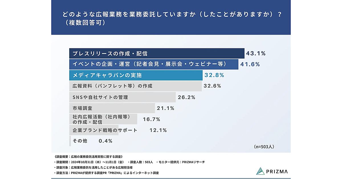 PRIZMAは、「広報の業務委託活用実態に関する調査」を実施した。広報業務委託を活用したことがある広報担当者503名が回答している。