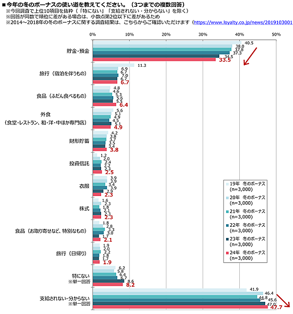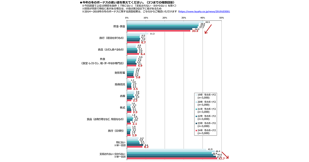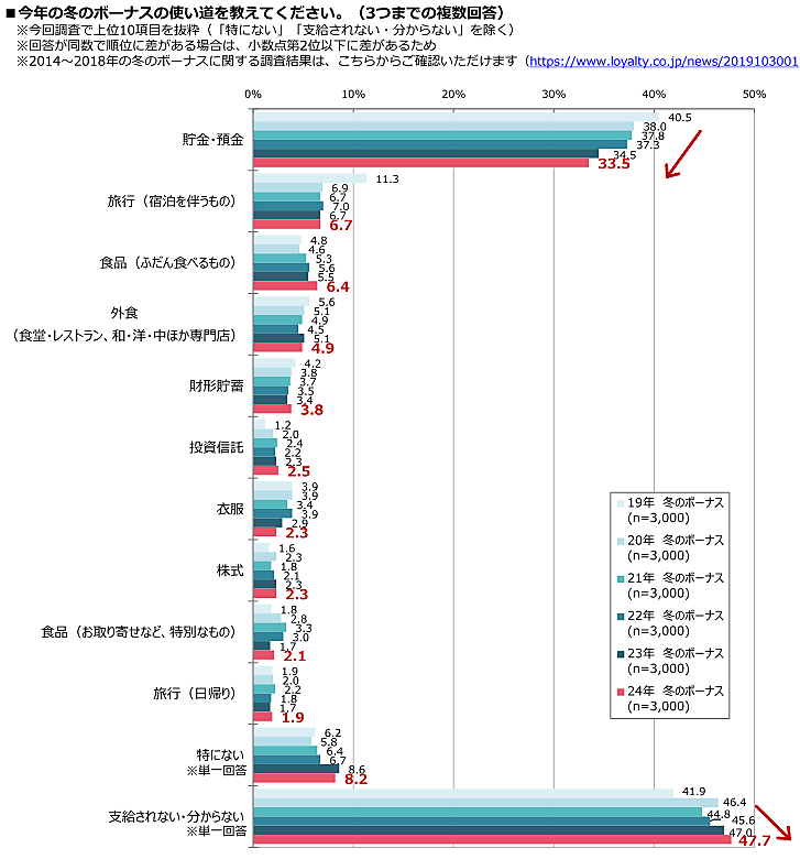 まず「今冬のボーナスの使い道」を聞くと、「貯金・預金」33.5%が11年連続で1位。一方で割合は5年連続で下がっており、過去最低を記録した。以下2位「旅行(宿泊をともなうもの)」6.7%、3位「食品(ふだん食べるもの)」6.4%が続く。また「支給されない・分からない」が半数近い47.7%となり、過去最高を更新した。