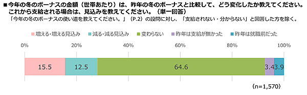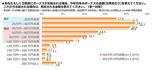 「冬のボーナスの支給金額は増加するか・減少するか」を聞くと、「変わらない」が6割以上を占めたが、「増える見込み」15.5%が「減る見込み」12.5%を上回る。支給金額(見込み額を含む)は、「40万円~60万円未満」から「100万円~120万円未満」が増加している。