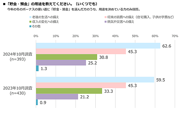 冬のボーナスの使い道に「貯金・預金」と答えた人に用途を聞くと、「決めている」としたのは39.1%で、最も多かったのは「老後の生活への備え」62.6%だった。また「病気や災害への備え」が前年から4.0ポイント増加して25.2%に上昇した。