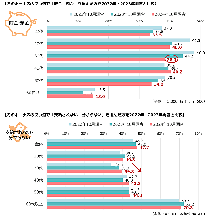「貯金・預金」「支給されない・分からない」について、前々年2022年・前年2023年の調査と比較すると、「貯金・預金」 は、20~30代・50代で減少傾向となり、特に30代が10%近く減少している。逆に「支給されない・分からない」は、30代で増加傾向が見られた。