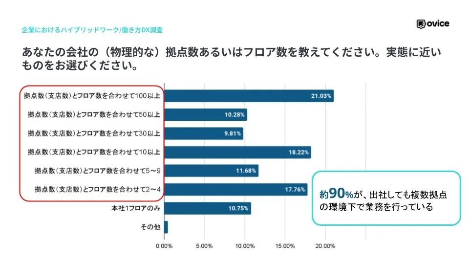 また、会社の拠点数およびフロア数を聞くと、「拠点数(支店数)とフロア数をあわせて100以上」が21.03%と最多で、「本社1フロアのみ」は10.75%にとどまった。大多数の人が出社環境にありつつも、複数拠点で仕事をしていることがわかった。