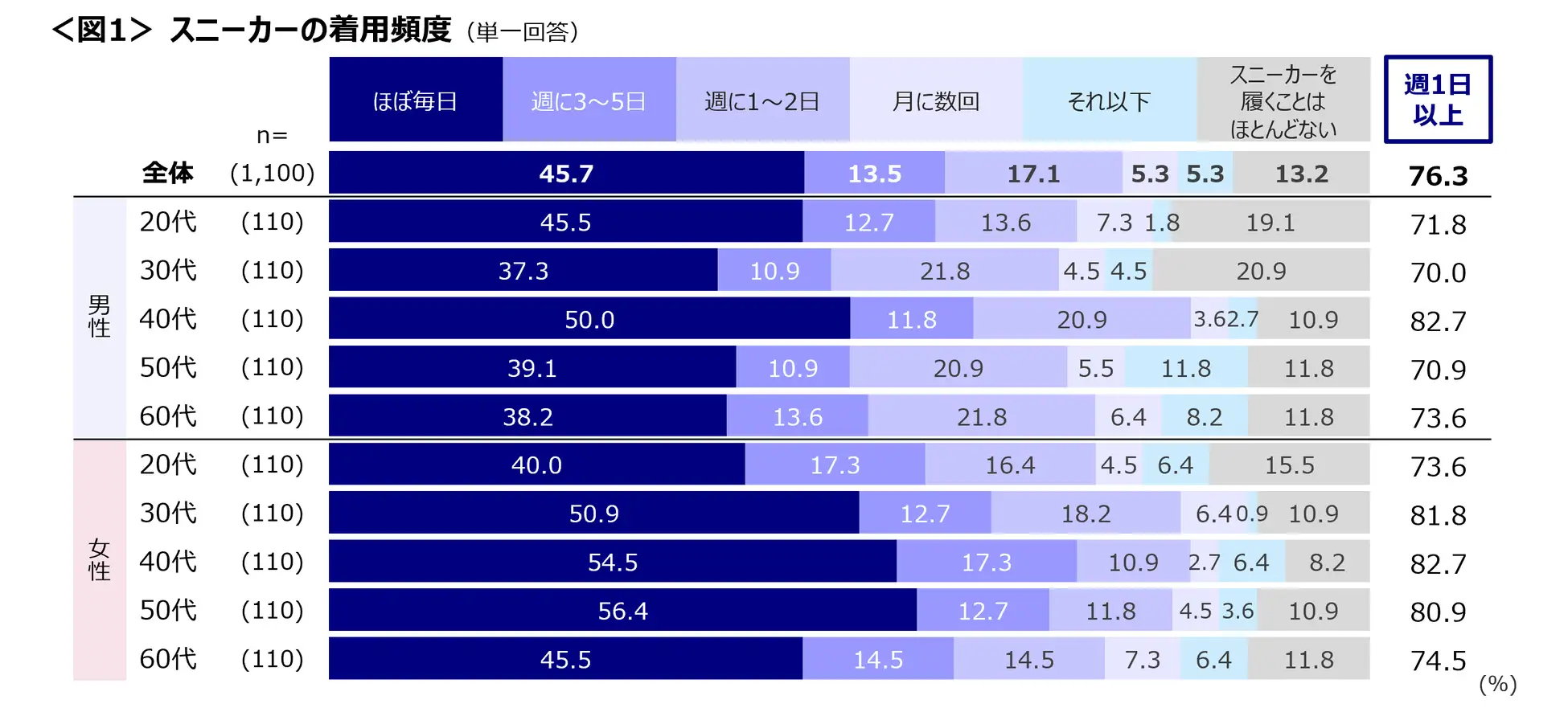 まず、スニーカーの着用頻度を性年代別に見ると、女性の30~50代で「ほぼ毎日」が半数を超えていた。一方で、男性の20~30代は「ほとんど履かない」が比較的多く、20代男性では19.1%、30代男性では20.9%にのぼった。