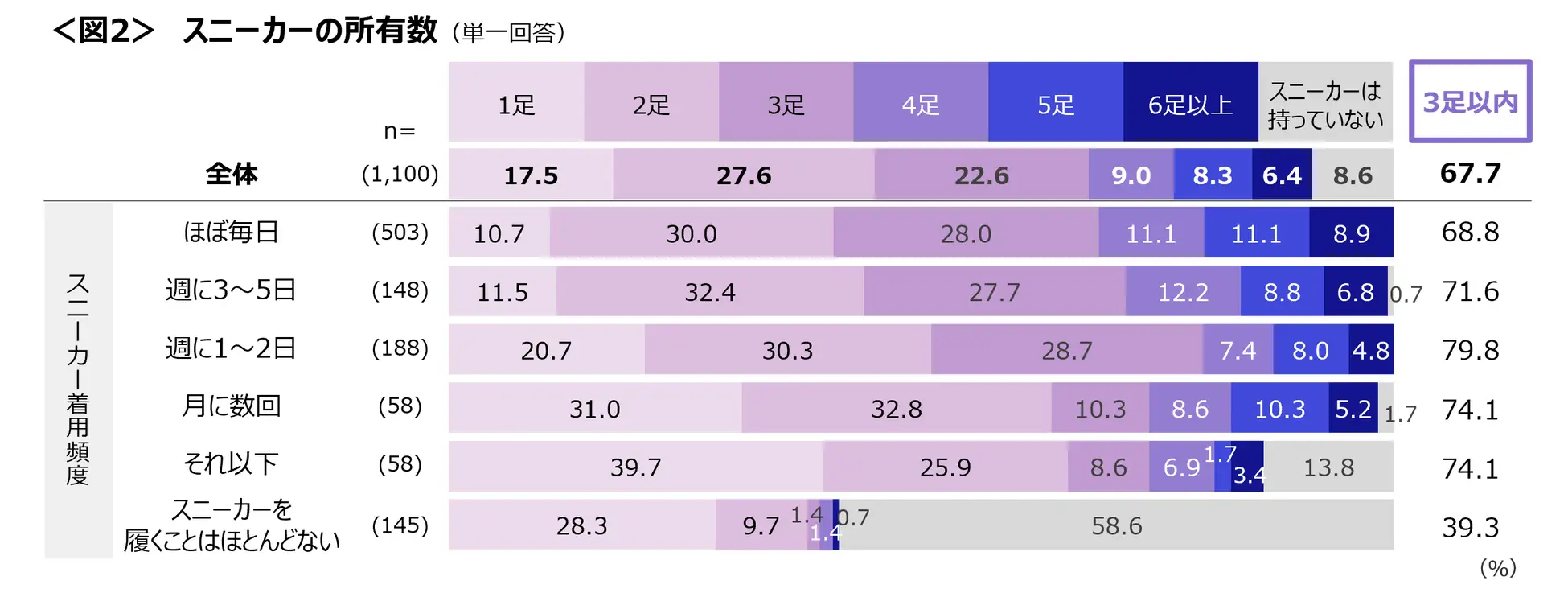 次にスニーカーの所有数を聞くと、全体では「1~3足」が合計で67.7%となった。着用頻度別に見ると、ほぼ毎日スニーカーを履く人でも所有数は「3足以内」が多数派となり、必要最低限しか所有していない様子がうかがえた。